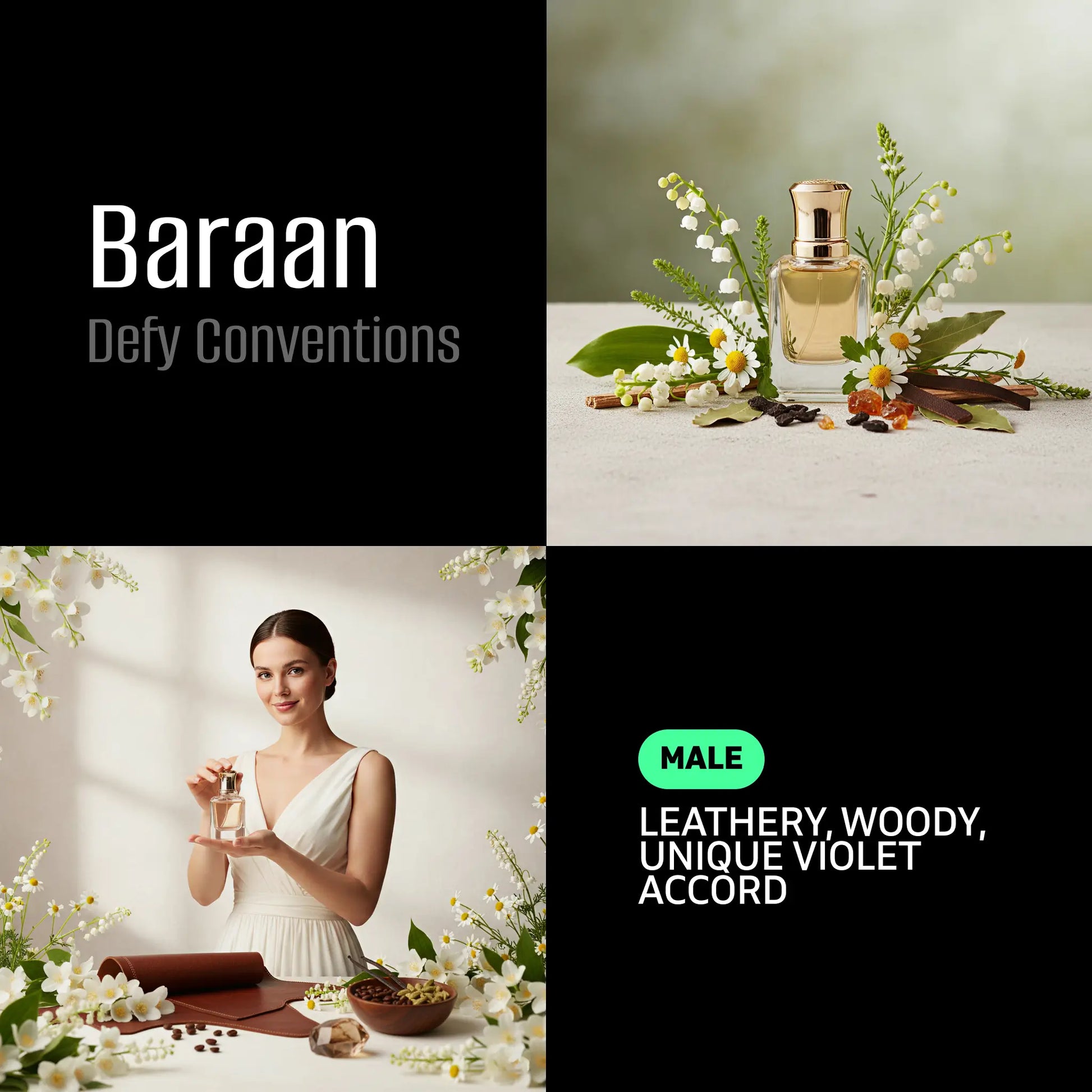 Baraan is for the man who defines his own style and Defies Conventions. Inspired by a legendary, highly distinctive fragrance, Baraan is a daring composition that demands attention and respect. This scent is not for the faint of heart—it is a strong, powerful statement of individuality and maturity.